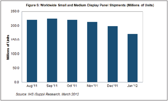 1月份中小顯示器面板出貨量約為1.713億個,比2011年12月的1.986億個大幅減少14%。這是該產(chǎn)業(yè)過去12個月以來的最大單月降幅,也是去年10月以來連續(xù)第四個月下降,如圖1所示。