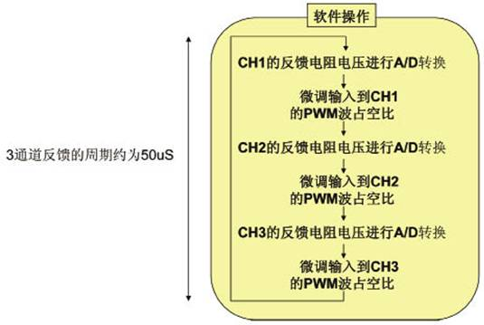 LED恒流控制操作流程圖如圖4所示,如圖,有3通道的LED需要控制,是A/D轉(zhuǎn)換→PWM輸出的微調(diào)的重復(fù)操作。軟件操作過程是對CH1的反饋電阻電壓進行A/D轉(zhuǎn)換,微調(diào)輸入到CH1的PWM波占空比,然后對通道2和通道3進行同樣操作,重復(fù)上述流程即可。三個通道的A/D轉(zhuǎn)換和檢測調(diào)整的整個周期約為50μs。