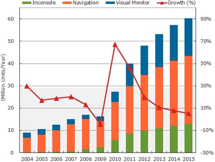 據NPD DisplaySearch– 平板顯示器于車載的應用已經越來越盛行,如汽車導航、多功能駕駛儀表盤、以及后座娛樂顯示屏幕等。NPD DisplaySearch預測應用于車載的面板出貨量將有望從2011年的4千2百萬片成長到2015年的6千2百萬片。