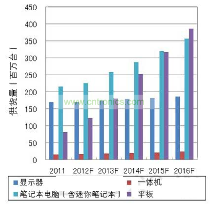 未來的市場動(dòng)向方面,筆記本電腦市場的年增長率有望達(dá)到10~15%左右,平板電腦市場將憑借低價(jià)格和輕便、應(yīng)用程序與智能手機(jī)的通用性,繼續(xù)保持大約30~40%的增長率,到2016年,平板電腦的供貨量預(yù)計(jì)將超過筆記本電腦(圖1)。