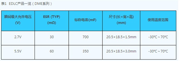 表1為村田制作所的EDLC產(chǎn)品一覽,圖4為使用了村田EDLC的LEDflach演示板。這個系統(tǒng)能在33毫秒內(nèi)向LED提供最大為8A的大電流。(可控制在2A-8A/10-60毫秒)