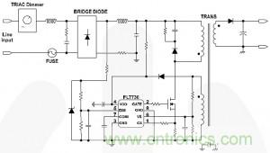 這一架構(gòu)現(xiàn)在已經(jīng)用于兩款新的PWM控制器,即可調(diào)光 FL7730 PWM 控制器和非調(diào)光 FL7732 PWM 控制器。圖2是簡(jiǎn)化的應(yīng)用原理圖,顯示用于TRIAC調(diào)光的FL7730器件。