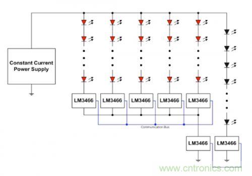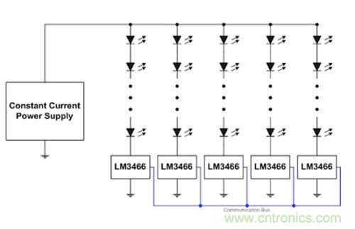 在本應(yīng)用中,LM3466 集成電路可互相通信,確保恒定電流電源所強(qiáng)加的輸入電流能夠在各串之間進(jìn)行平均分配。線(xiàn)性穩(wěn)壓器會(huì)吸收 LED 堆棧正向電壓的任何差異。