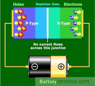 如果嘗試使電流向其它方向流動(dòng),P型端就邊接到電流負(fù)極和N型連接到正極,這時(shí)電流將不會(huì)流動(dòng)。N型物質(zhì)的負(fù)極電子被吸引到正極電子。P型物質(zhì)的正極電子空穴被吸引到負(fù)極電子。因?yàn)殡娮涌昭ê碗娮佣枷蝈e(cuò)誤的方向移動(dòng)所以就沒(méi)有電流流通過(guò)匯合處,損耗區(qū)增加。