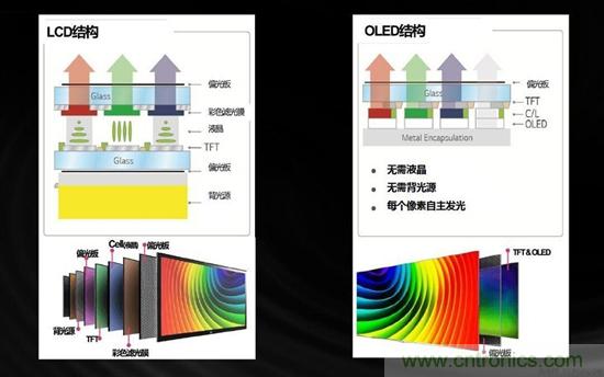如果將OLED與傳統(tǒng)LCD結(jié)構(gòu)進行對比,OLED最大的特點是無需液晶、無需背光源和每個像素都能自主發(fā)光,從圖中看OLED的結(jié)構(gòu)的確更加簡單,而正是這樣的結(jié)構(gòu)設(shè)計讓它有了超越傳統(tǒng)的優(yōu)異表現(xiàn)。
