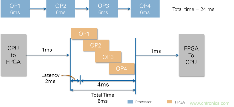 CPU按順序執(zhí)行操作,因此第一個(gè)操作必須在整個(gè)圖像上運(yùn)行結(jié)束后,第二個(gè)操作才能啟動(dòng)。在本例中,假設(shè)算法中的每個(gè)步驟在CPU上運(yùn)行需要6ms;因此,總處理時(shí)間是24毫秒?,F(xiàn)在考慮在FPGA上運(yùn)行相同的算法。由于FPGA本質(zhì)上是大規(guī)模并行的,所以該算法中的四個(gè)操作可以同時(shí)對(duì)圖像中的不同像素上操作。這意味著接收第一個(gè)處理的像素僅需2ms的時(shí)間,處理整個(gè)圖像需要4ms的時(shí)間,因而總處理時(shí)間為6ms。這比CPU的執(zhí)行速度快得多。即使使用FPGA協(xié)處理架構(gòu)并將圖像傳輸?shù)紺PU,整個(gè)處理時(shí)間(包括傳輸時(shí)間)也比單獨(dú)使用CPU要短得多。