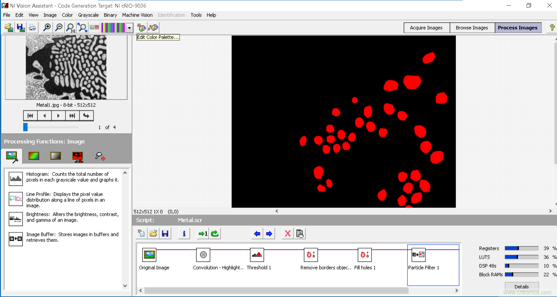 為了實(shí)現(xiàn)生產(chǎn)率的最大化,不論使用哪種處理平臺(tái),都需要立即獲得關(guān)于算法的反饋和基準(zhǔn)測(cè)試信息。當(dāng)使用迭代探索性方法時(shí),實(shí)時(shí)查看算法結(jié)果將會(huì)節(jié)省大量時(shí)間。什么是正確的閾值?用二進(jìn)制形態(tài)濾波器剔除的顆粒多大或多小?哪種圖像預(yù)處理算法和算法參數(shù)可以最好地清理圖像?這些都是開發(fā)視覺算法時(shí)的常見問(wèn)題,而關(guān)鍵在于是否能夠更改并快速查看結(jié)果。然而,傳統(tǒng)的FPGA開發(fā)方法可能會(huì)減緩創(chuàng)新,因?yàn)樗惴ǖ拿總€(gè)設(shè)計(jì)變化之間需要編譯時(shí)間。克服這一點(diǎn)的一個(gè)方法是使用一個(gè)算法開發(fā)工具,可讓您在同一個(gè)環(huán)境進(jìn)行CPU和FPGA的開發(fā)工作,而不會(huì)在FPGA編譯時(shí)陷入困境。NI Vision Assistant是一種算法工程工具,用于開發(fā)部署到CPU或FPGA上的算法,以幫助您簡(jiǎn)化視覺系統(tǒng)設(shè)計(jì)。您還可以使用Vision Assistant在目標(biāo)硬件上編譯和運(yùn)行之前測(cè)試算法,同時(shí)輕松訪問(wèn)吞吐量和資源利用率信息。