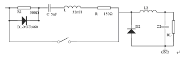 在開關(guān)控制電源的輸入部分加入緩沖電路(見圖3),其由線性阻抗穩(wěn)定網(wǎng)絡(luò)組成,用于消除電力線干擾、電快速瞬變、電涌、電壓高低變化和電力線諧波等潛在的干擾。緩沖電路器件參數(shù)為D1為MUR460,R1=500Ω,C=6nF,L=36mH,R=150Ω。