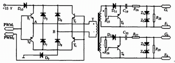 該系統(tǒng)主電路的開關管使用IGBT, 用脈沖變壓器作驅動。當IGBT容量較小時UC3846的11腳和14腳可以直接驅動變壓器; 當IGBT容量較大時, 可以采用圖3所示的驅動電路。該驅動電路結構簡單, 具有負壓關斷能力, 且驅動功率大。電路中, 二極管D9、D10有助于T1~T4的關斷。