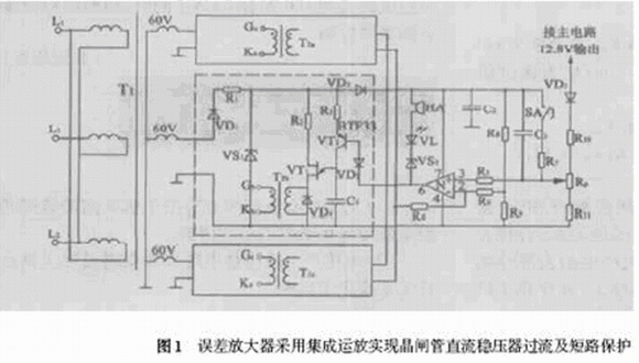 盡管功率場效應(yīng)VDMOS 和絕緣柵雙極型晶體管IGBT等電力半導體元器件層出不窮,且在電力電子技術(shù)領(lǐng)域占據(jù)重要位置,晶閘管(可控硅) 卻因耐高壓耐大電流沖擊的特性,仍有著穩(wěn)固的陣地,受到用戶的青睞。在擯棄電流采樣、放大和執(zhí)行等多個環(huán)節(jié)的情況下,將單結(jié)晶體管移相觸發(fā)器中的晶體管誤差放大器改為集成運算放大器,就可實現(xiàn)晶閘管直流穩(wěn)壓器的過流及短路保護,簡化了電路結(jié)構(gòu),并提高了整機的穩(wěn)定可靠性能和AC - DC變換效率。