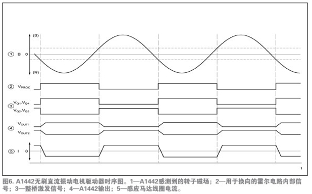 A1442是驅(qū)動(dòng)馬達(dá)唯一必須的的IC。圖5所示的功能模塊圖說(shuō)明了設(shè)備運(yùn)行和先進(jìn)的特性。注意圖4和圖5中,采用集成的霍爾傳感器免除了外部霍爾傳感器,從而減少了馬達(dá)PCB元件數(shù)量。唯一所需的外部元件是一種標(biāo)準(zhǔn)電路特性——位于應(yīng)用馬達(dá)安裝PCB上的0.1µF的旁路電容,它用于降低在開關(guān)電源的電感負(fù)載時(shí)產(chǎn)生的瞬時(shí)電壓峰值。