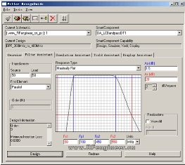 d.在彈出的“Filter DesignGuide”窗口中選擇“Filter Assistant”選項(xiàng)卡,設(shè)置濾波器參數(shù),點(diǎn)擊左下角的“Design”按鈕,如圖3所示。