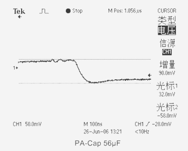 4、當(dāng)測(cè)試電容采用(PA-Cap)聚合物片式疊層鋁電解電容器CT=56μF ESR=23mΩ時(shí),輸出電壓下跌值為90mV。