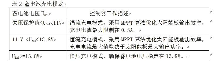 當系統(tǒng)檢測到環(huán)境光充足,控制器就會進入充電模式。蓄電池充電有兩個比較重要的電壓值:深度放電電壓和浮充充電電壓。前者代表在正常使用情況下蓄電池電能被用完的狀態(tài), 而后者則代表蓄電池充電的最高限制電壓,這些參數(shù)應(yīng)該從蓄電池產(chǎn)品手冊上可以查到。在設(shè)計電路中針對12V蓄電池,分別設(shè)置深度放電電壓為11V和浮充充電電壓為13.8V(皆為在室溫條件下的電壓值,軟件中這兩個值增加了相應(yīng)的溫度補償),具體充電模式如表2所示。