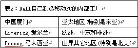 在后端,Dell采用復(fù)雜的按客戶訂單進(jìn)行配置(CTO)的營運(yùn)模式來支持這種產(chǎn)品定制。對(duì)移動(dòng)PC,Dell有三個(gè)內(nèi)部制造工廠來支持它所服務(wù)的主要終端市場(chǎng)。表2所示為Dell自己制造移動(dòng)PC的內(nèi)部工廠。