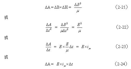 在圖2-12中,ΔA是在變壓器鐵芯磁滯回線中任意取出來進(jìn)行分析的面積,ΔA面積的取值可以任意的小,以保證在此面積中變壓器鐵芯的導(dǎo)磁率可以看成是一個常數(shù)。與ΔA面積對應(yīng)的有磁感應(yīng)強(qiáng)度增量ΔB和磁場強(qiáng)度增量ΔH以及時間增量Δt。根據(jù)磁場強(qiáng)度、磁通密度的定義,以及電磁感應(yīng)的定理,可以列出下面關(guān)系試關(guān)系式: