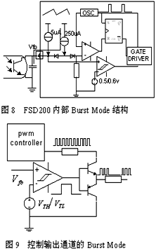 而FSD200則是通過控制內(nèi)部驅(qū)動器實現(xiàn)可控脈沖模式,即將Vfo 腳的反饋電壓與0.6V/0.5V遲滯比較器比較,由比較結(jié)果控制門極驅(qū)動輸出,其結(jié)構(gòu)可見圖8。我們可根據(jù)此原理用分立元件實現(xiàn)普通芯片的BurstMode功能,即檢測次級電壓判斷電源是否處于待機狀態(tài),通過遲滯比較器,控制芯片輸出,電路如圖9所示。