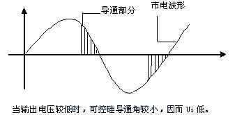 而當(dāng)輸出電壓Uo很低時(shí),可控硅導(dǎo)通角很小,絕大部分市電電壓被可控硅“卡斷了”(如下圖所示),只讓很低的電壓加在變壓器初級(jí),即Ui很低,這當(dāng)然經(jīng)整流濾波后輸出電壓也就很低了。