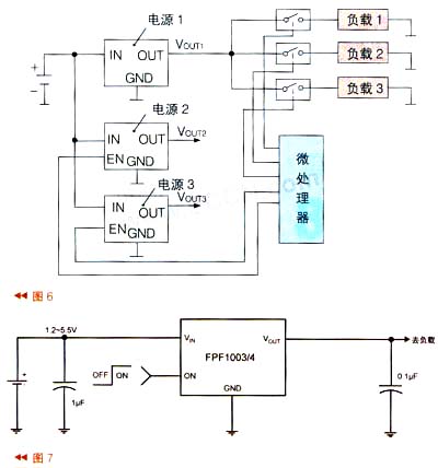 在實際應用中,往往由于電路復雜而采用電源管理IC及多個負載開關組成的負載管理系統,如圖6所示。圖6中有3個電源,輸出不同的電壓。電源1給負載1~3供電。為了控制負載1~3的通電或失電,在電源與負載之間設了3個負載開關。電源2、電源3則由電源管理IC來控制其負載的通電或失電。