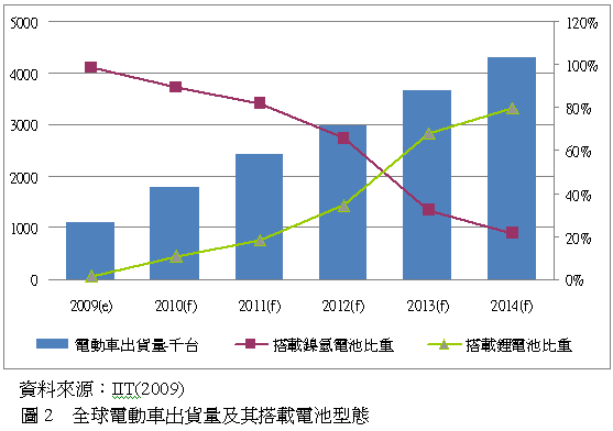 2009年全球汽車出的出貨量約為6300萬臺(tái),當(dāng)中電動(dòng)車出貨量約為110萬臺(tái),目前電動(dòng)車市場(chǎng)份額小,而且以鎳氫電池為主,不過在鋰電池持續(xù)的發(fā)展下相當(dāng)有機(jī)會(huì)在2013年就取代鎳氫電池成為電動(dòng)車用電池的主要電池型態(tài)。依照IIT在2009年的預(yù)估,全球的電動(dòng)車用電池型態(tài)在2012年就會(huì)有很明顯 的改變,到2012年鎳氫電池約佔(zhàn)全球電動(dòng)車比重的六成五、鋰電池佔(zhàn)三成五,到2013年就會(huì)出現(xiàn)黃金交叉點(diǎn),鋰電池佔(zhàn)全球電動(dòng)車比重的六成八、鎳氫電池 佔(zhàn)三成二,顯示隨著時(shí)間的經(jīng)過鋰電池的安全性以及電容量得到實(shí)證的支持,會(huì)讓鋰電池的飛輪在未來快速起飛,如圖2。
