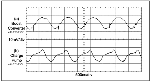 圖5.如果開關頻率為1MHz,驅動同樣數(shù)量的LED,采用相同的輸入電容,那么電荷泵(b)和升壓轉換器(a)的輸入紋波基本相同。然而,由于電荷泵與LED之間有較多引線,建議使用更短的連線(天線),另外,泵電容產生的EMI低于升壓轉換器的電感。