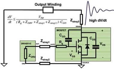 圖7解釋了讓柵極驅(qū)動(dòng)器靠近功率MOSFET為什么如此有用。柵極驅(qū)動(dòng)器的非零輸出阻抗ZDRV必須通過寄生阻抗Zstray1和Zstray2,以及柵極阻抗Rg來控制MOSFET,尤其是關(guān)斷。這時(shí),漏極上的高dV/dt加上柵極路徑上的高阻抗,可能引起MOSFET的寄生導(dǎo)通。而利用極短的連線和功能強(qiáng)大的柵極驅(qū)動(dòng)器,幾乎可以實(shí)現(xiàn)完美的開關(guān)。