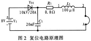 圖2中,V1為低壓直流電源,R1為限流電阻。由V1通過R1提供一個(gè)直流電流給單匝復(fù)位線圈A。在高壓脈沖變壓器工作時(shí),單匝線圈A上會(huì)感應(yīng)較高的電壓,利用電感L1,電容C1和高壓硅堆VD1對(duì)低壓直流電源V1進(jìn)行保護(hù)。