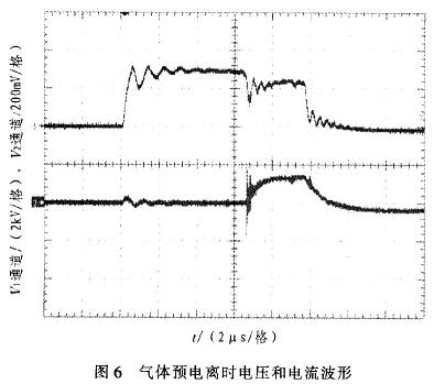 圖4中,縱坐標(biāo)為電壓幅度值(2通道2kV/格,4通道200mV/格)。通道2為電壓波形,電壓約為5kV,脈沖寬度為10μs,上升沿小于lμs。通道4為電流波形,電流值約85A(波形圖中比例為l:500)。圖5中,脈沖周期為5ms,重復(fù)頻率為200Hz。圖6中,縱坐標(biāo)為電壓幅度值(1通道5kV/格,2通道2V/格)。l通道為放電電壓波形,2通道為放電電流波形。從波形圖中可以看出,脈沖當(dāng)電壓加在氣體上時(shí),大約經(jīng)過幾微秒時(shí)間后,氣體發(fā)生電離。此時(shí)由于分壓原因,電壓幅值略有下降,電流波形開始出現(xiàn)。在脈沖電壓加載期間,氣體維持了電離狀態(tài)。