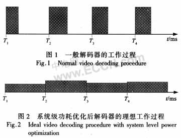 目前,在多媒體SOC設(shè)計過程中,針對其重要的視頻應(yīng)用的負載特性進行功耗優(yōu)化是一個非常熱點的研究問題。常見的低功耗設(shè)計技巧主要有動態(tài)電壓調(diào)整(dynamicvoltagescale,DVS)和動態(tài)功率管理(dynamicpowermanagement,DPM)技術(shù)。在DVS技術(shù)中,在保證服務(wù)質(zhì)量的同時,讓不同計算量的任務(wù)運行在不同的工作電壓和頻率;而DPM技術(shù)則在運行過程中,動態(tài)關(guān)閉系統(tǒng)某些空閑模塊。在眾多針對多媒體應(yīng)用進行低功耗設(shè)計的研究中,其主要思路可分為兩類。一種是將多媒體應(yīng)用的負載當作一個隨機過程,然后采用馬爾可夫或者半馬爾可夫模型預(yù)測負載,再根據(jù)預(yù)測結(jié)果調(diào)整當前系統(tǒng)運行狀態(tài)。如在文中,提出了一種基于回歸方程的方式,通過系統(tǒng)當前“工作”和“空閑”時間預(yù)測即將到來的“工作”和“空閑”時間。分別利用離散馬爾可夫時間序列和連續(xù)馬爾可夫序列算法預(yù)測系統(tǒng)負載。以上這些方式都有效地降低了系統(tǒng)功耗開銷,但是其最大不足之處在于多媒體應(yīng)用的編碼方式和內(nèi)容多種多樣,無法找到一種合適的模型來適應(yīng)所有多媒體應(yīng)用。另外一方面,也有研究利用實時反饋控制的方式,來調(diào)整當前系統(tǒng)運行狀態(tài)的方式來降低多媒體系統(tǒng)的功耗。