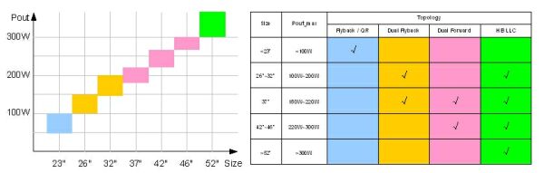 圖4:傳統(tǒng)式LCDTV主電源功率范圍及架構(gòu)選擇。