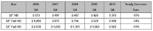 表3:DisplaySearch對LCDTV成本的近年數(shù)據(jù)統(tǒng)計(jì)及未來走勢預(yù)測。