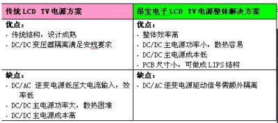 表4:傳統(tǒng)LCDTV電源方案與昂寶電子方案優(yōu)缺點(diǎn)的比較。