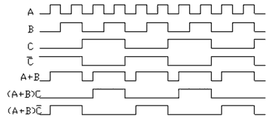由14級串行二進制計數(shù)/分配器CD4020B構成分頻電路,分頻信號來自SG3525A的振蕩器輸出端引腳4。圖4中的A、B、C分別代表振蕩器脈沖經8、9、10級分頻后的波形,其頻率分別為fA=fOSC/28,fB="fOSC/29",fC="fOSC/210"。分相電路由單片兩輸入端四與非門CD4011BC及外圍器件組成,將信號ABC邏輯組合成逆變橋所需要的驅動脈沖(A+B)C與(A+B)C信號。該驅動信號具有共同死區(qū),信號頻率約為50Hz。
