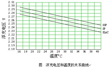 在電源系統(tǒng)中,電池總是在線備用工作的,這樣電池基本處于長(zhǎng)期的浮充狀態(tài)中,浮充電壓的選取對(duì)電池的長(zhǎng)期可靠運(yùn)行起著至關(guān)重要的作用,正如前面看到的,偏高的浮充電壓會(huì)造成電池緩慢失水并發(fā)產(chǎn)生熱失控而使電池失效;偏低的浮充電壓會(huì)造成電池長(zhǎng)期處于充不飽電的狀態(tài),使電池發(fā)生硫酸化而導(dǎo)致電池失效。正確的浮充電壓一般應(yīng)選在2.23V/單體.,并應(yīng)隨同電池工作溫度進(jìn)行相應(yīng)調(diào)整,由于電池生產(chǎn)廠家的不同,這一參數(shù)會(huì)有一些差異,應(yīng)嚴(yán)格按照廠家提供的參數(shù)選取。下圖是某廠家電池浮充電壓同溫度的關(guān)系曲線。