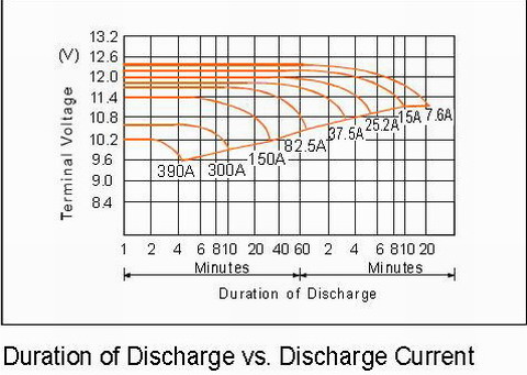 上圖是蓄電池生產(chǎn)廠家提供的150AH/12V蓄電池放電曲線。在實際使用時根據(jù)不同的負載電流選定不同的放電終止電壓。在該放電曲線中,以10小時放電和5小時放電曲線為例,對于10小時放電(負載電流為15A)來說,如果放電到終止電壓11V(44V),此時蓄電池放出的容量大約為100%。一般情況下,為了保護蓄電池盡量避免其深度放電,放電深度最好≤80%,終止電壓在46V左右,放電時間約為8小時。對于5小時的放電率來說(負載電流為25.2A),終止電壓10.8V(43.2V)放出100%容量,在實際使用時放電深度≤80%,終止電壓在45.6左右,放電時間為4小時。