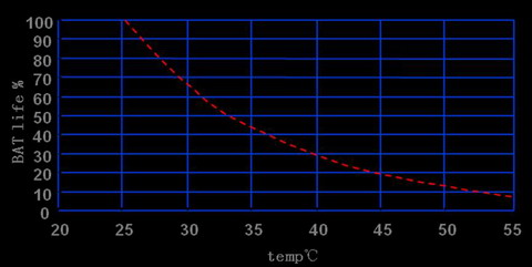 失水的途徑比較多:節(jié)流閥設計不合理,頻繁開啟;電源對蓄電池頻繁均充;環(huán)境溫度過高。其中高溫是最主要的因素,高溫會加速蓄電池失水速度,導致蓄電池容量下降。以25℃為基準,當蓄電池運行環(huán)境上升10℃,壽命減少50%。如圖2所示。