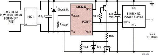 圖1b:采用LTC4257實(shí)現(xiàn)的符合基本802.3af標(biāo)準(zhǔn)的PD電路。