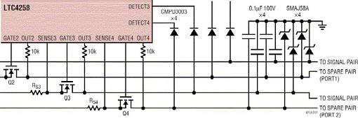 要改變每個(gè)通道的其它兩個(gè)元件,以處理額外的電流。典型情況下,MOSFETQ4要用較大的器件取代,以在電流限制期間承受更大的功率。在這種應(yīng)用中,采用D2PAK封裝的IRF530類器件就足夠了。此外,也要指定PoE數(shù)據(jù)磁性模塊以承載更高的電流。幾家磁性元件供應(yīng)商最近推出了具有足夠電流能力的器件。