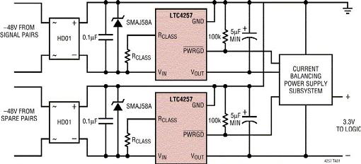 四對(duì)PD電路是最大的變化(圖4b)?,F(xiàn)在需要采用兩個(gè)LTC4257器件,電源電路必須具備足夠的智能,以便把從每一個(gè)通道吸取的電流限制在802.3af規(guī)范容許的范圍之內(nèi)。要做到這一點(diǎn),就要平衡從每一對(duì)線吸取的電流或平衡從每一對(duì)線吸取的功率,直到它接近(但是不超過)ICUT極限,然后,才從其它線對(duì)吸取電流。這種電路可能相當(dāng)復(fù)雜,不同的設(shè)計(jì)之間差異也很大。