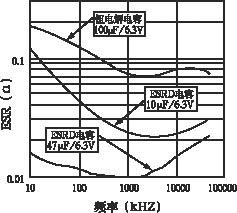 圖5是在不同頻率下100μF的鉭電容、10μF及47μF的ESRD電容的ESR值的變化情況。由圖可以看出,在1MHz時(shí),10μF的ESRD電容的ESR值約為0.012Ω,而100μF的鉭電容在1MHz時(shí)約為0.016Ω,二者的容量差10倍,這說(shuō)明ESRD電容具有良好的高頻性能。