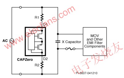 要想實現(xiàn)待機電流接近零的目標,就必須找到能消除R1和R2連續(xù)電流消耗的解決方案。PowerIntegrations新推出的CAPZeroIC可以輕松實現(xiàn)這一點。圖2所示為CAPZero在典型應(yīng)用中的使用情況。