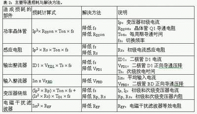 開關(guān)電源的損耗包含導(dǎo)通損耗、開關(guān)損耗以及外圍控制電路損耗,電路不同部分的損耗成因各不相同,因此抑制損耗的方法也有不同。需要用數(shù)學(xué)方程式量化這些損耗,進而整理出降低各部分損耗的方法,才能得出具體有效降低整體損耗的方案。為了討論方便,本文以常用的回掃轉(zhuǎn)換器為例,將各部分損耗以數(shù)學(xué)方程式表示,并列出解決方法。表2、表3及表4分別為導(dǎo)通損耗、切換損耗以及外圍控制電路損耗的原因分析與解決對策。