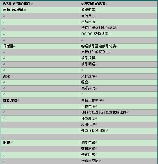 表 1:影響無線傳感器節(jié)點功耗的因素