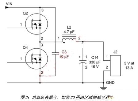 在一個(gè)電源的正確配置中,必須將大電流導(dǎo)體的回路部分縮減至最小。這樣做能夠?qū)⒆鳛樘炀€源和發(fā)射能量的電感降至最低。其中一個(gè)層面是有效放置元件及選用去耦電容。圖3顯示同步降壓轉(zhuǎn)換器的輸出功率級(jí)與濾波器。C3將功率級(jí)去耦合,以便在Q2啟動(dòng)時(shí)提供低阻抗源。為了將輻射發(fā)射量降至最低,必須如圖所示連接C3,其中電容的固有阻抗、電路信號(hào)線及通過電感的互連均縮減至最小。另外,也需要具有諸如X7R等高自振頻率的高品質(zhì)電容電介質(zhì)。