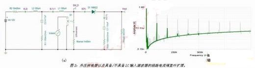 只要加入L2及C2,波形便會(huì)變成正弦曲線,而能量會(huì)重新調(diào)整為相當(dāng)?shù)偷母哳l率峰值。不過,如果不能正確設(shè)計(jì)輸入濾波器,則會(huì)將噪聲放大而使得控制回路不穩(wěn)定。因此,了解濾波器設(shè)計(jì)的概念,對(duì)于優(yōu)化濾波器回波及成本相當(dāng)重要。使用SPICE的AC分析是有效了解濾波器行為的工具。