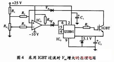 當(dāng)電源輸出過載或者短路時(shí),IGBT的Vce值則變大,根據(jù)此原理可以對(duì)電路采取保護(hù)措施。對(duì)此通常使用專用的驅(qū)動(dòng)器EXB841,其內(nèi)部電路能夠很好地完成降柵以及軟關(guān)斷,并具有內(nèi)部延遲功能,可以消除干擾產(chǎn)生的誤動(dòng)作。其工作原理如圖4所示,含有IGBT過流信息的Vce不直接發(fā)送到EXB841的集電極電壓監(jiān)視腳6,而是經(jīng)快速恢復(fù)二極管VD1,通過比較器IC1輸出接到EXB841的腳6,從而消除正向壓降隨電流不同而異的情況,采用閾值比較器,提高電流檢測(cè)的準(zhǔn)確性。假如發(fā)生了過流,驅(qū)動(dòng)器:EXB841的低速切斷電路會(huì)緩慢關(guān)斷IGBT,從而避免集電極電流尖峰脈沖損壞IGBT器件。