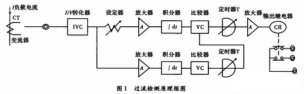 過流檢測(cè)傳感器的工作原理如圖1所示。通過變流器所獲得的變流器次級(jí)電流經(jīng)I/V轉(zhuǎn)換成電壓,該電壓直流化后,由電壓比較器與設(shè)定值相比較,若直流電壓大于設(shè)定值,則發(fā)出辨別信號(hào)。但是這種檢測(cè)傳感器一般多用于監(jiān)視感應(yīng)電源的負(fù)載電流,為此需采取如下措施。由于感應(yīng)電源啟動(dòng)時(shí),啟動(dòng)電流為額定值的數(shù)倍,與啟動(dòng)結(jié)束時(shí)的電流相比大得多,所以在單純監(jiān)視電流電瓶的情況下,感應(yīng)電源啟動(dòng)時(shí)應(yīng)得到必要的輸出信號(hào),必須用定時(shí)器設(shè)定禁止時(shí)間,使感應(yīng)電源啟動(dòng)結(jié)束前不輸出不必要的信號(hào),定時(shí)結(jié)束后,轉(zhuǎn)入預(yù)定的監(jiān)視狀態(tài)。
