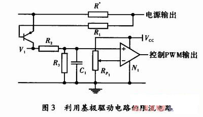 在一般情況下,利用基極驅(qū)動(dòng)電路將電源的控制電路和開關(guān)晶體管隔離開。控制電路與輸出電路共地,限流電路可以直接與輸出電路連接,工作原理如圖3所示,當(dāng)輸出過載或者短路時(shí),V1導(dǎo)通,R3兩端電壓增大,并與比較器反相端的基準(zhǔn)電壓比較??刂芇WM信號(hào)通斷。