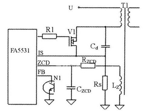 功率隔離變換器電路如圖5所示,由控制電路和反激式變換器組成。圖中,變壓器輔助繞組LZ、電阻RZCD、電容CzcD組成谷底探測(cè)電路,為控制芯片F(xiàn)A5531提供谷底檢測(cè)信號(hào)。光電耦合器N1次級(jí)將輸出電壓反饋信號(hào)輸入控制芯片。電路啟動(dòng)后,F(xiàn)A5531輸出驅(qū)動(dòng)信號(hào)使V1導(dǎo)通,V1電流上升,此電流由Rs檢測(cè)輸入到控制芯片的IS引腳,與由反饋輸入FB引腳的電壓決定的參考電壓進(jìn)行比較,達(dá)到參考電壓時(shí),V1關(guān)斷,變壓器繞組電壓反相,變壓器初級(jí)電感向次級(jí)負(fù)載饋送能量。當(dāng)向次級(jí)饋送能量過程結(jié)束時(shí),次級(jí)電流下降到零。變壓器漏感與開關(guān)管寄生電容Cd構(gòu)成了諧振電路,變壓器輔助繞組感應(yīng)此諧振電路的諧振電壓,并輸入到FA5531P的ZCD引腳。當(dāng)次級(jí)電流下降到零時(shí),諧振電路的諧振電壓迅速下降,輔助繞組的感應(yīng)電壓也迅速下降,當(dāng)ZCD引腳上的電壓降至谷底探測(cè)閾值時(shí),F(xiàn)A5531P驅(qū)動(dòng)輸出使V1重新導(dǎo)通。由于電阻RzcD、電容CzcD會(huì)引入延時(shí),選擇合適的RzcD、CzcD值,就可實(shí)現(xiàn)V1零電壓開通。