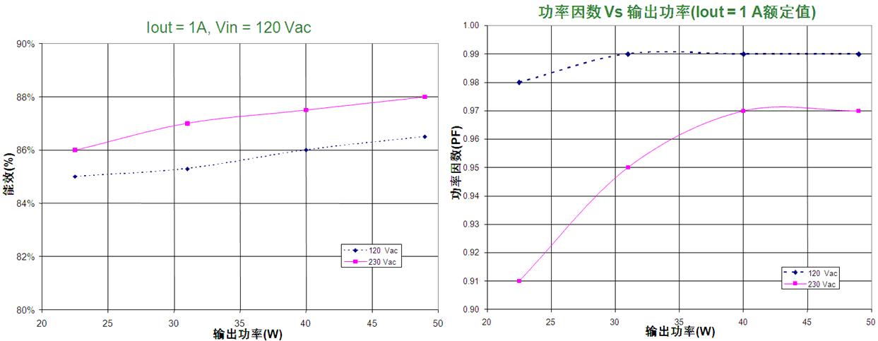 這90 W恒壓恒流演示板接受90至265 Vac的擴展通用輸入電壓(更換元件條件下可支持305 Vac),提供0.7 A至1.5 A的恒定電流輸出范圍(可通過微幅調(diào)節(jié)電阻來選擇)及30 V至55 V的恒定輸出電壓范圍(可通過電阻分壓器來選擇),最大輸出功率90 W,支持50至1,000 Hz調(diào)光控制,并包含可連接至可選調(diào)光卡的6引腳接口,用于模擬電流調(diào)節(jié)/雙亮度等級數(shù)字調(diào)光等智能調(diào)光應用。此外,這演示板還提供短路保護、開路保護、過溫保護、過流保護及過壓保護等豐富保護特性。測試顯示,這演示板在50 W輸出功率、1,000 mA輸出電壓/48 V正向壓降條件的能效高于87%(詳見表1),在50%至100%負載條件下功率因數(shù)高于0.9,同時符合IEC61000-3-2 C類設備諧波含量標準。